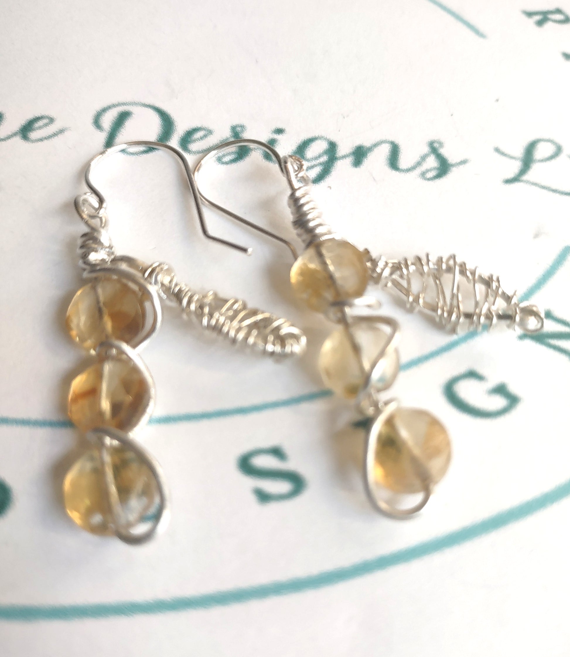 Autumn leaves adorn this pair of earrings. Beautiful pale yellow citrine coin semi-precious gemstone beads and sterling silver make up this beautiful pair of earrings. Citrine know as the "success stone," It is believed to represent the energy of the sun. It is also know as the joy stone and is said to bring success and prosperity to wearers. Each earring has a sterling silver wire wrapped leaf charm dangling on its side. Really charming!